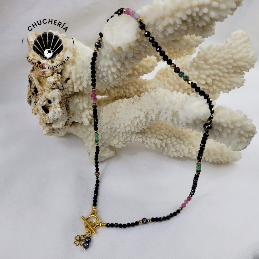 Naszyjnik skomponowany ze spineli, różowych turmalinów, zoisytu z rubinem oraz pereł. Zapinany z przodu na zapięcie typu toggle (patyczek z kółeczkiem).  Przy zapięciu ozdobiony zawieszkami z koniczynką i perłami.